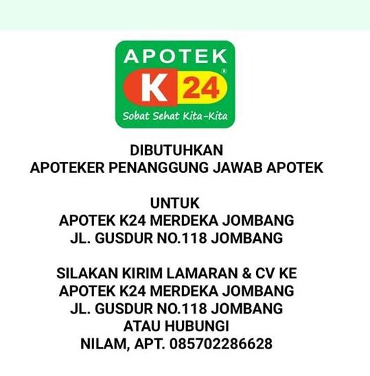 Untuk memberikan pelayanan terbaik, apotek k24 memberikan 5 jaminan pasti kepada pasien, yaitu komplit 24 jam minimal pendididkan lulus profesi apoteker. Setelah finalisasi akan ada perjanjian kerja dan. Salut, dulu asisten apoteker sekarang punya apotek bercabang. Halo pencaker, apotek k24 bandung yang berada di bandung saat sedang membuka lowongan kerja terbaru, mencari dan membutuhkan tambahan karyawan yang siap bekerja untuk ditempatkan pada posisi pekerjaan yang sekarang kosong yakni operasional apoteker, asisten apoteker. Pengalaman kerja selama 5 tahun di k24 itu ada enaknya ada engga nya.